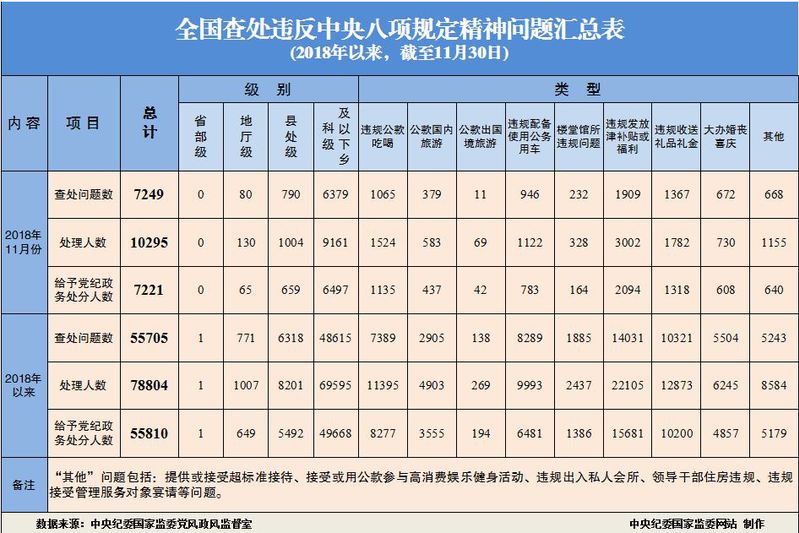 为掌握全国贯彻落实中央八项规定精神情况,中央纪委在各省区市和新疆生产建设兵团、各中央和国家机关、各中央企业和中央金融企业等建立了落实中央八项规定精神情况月报制度。2018年以来,截至11月30日,全国查处违反中央八项规定精神问题情况如下: