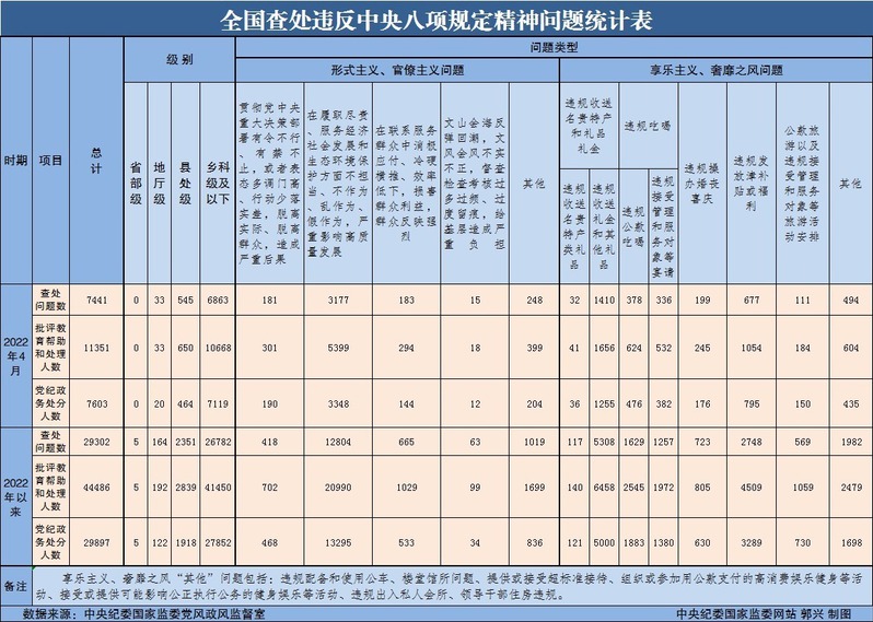 5月29日,中央纪委国家监委公布2022年4月全国查处违反中央八项规定精神问题汇总情况。当月,全国共查处违反中央八项规定精神问题7441起,批评教育帮助和处理11351人,其中,党纪政务处分7603人。这是连续第104个月公布月报数据。